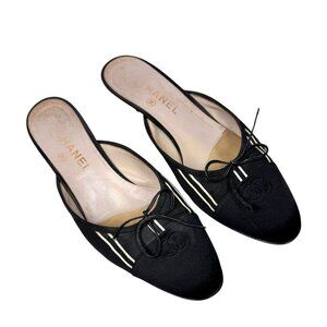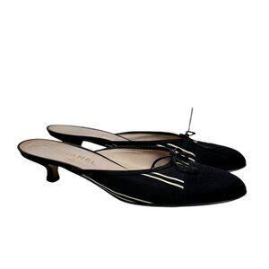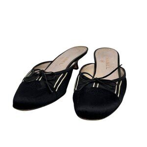 VTG CHANEL Satin Cap ToeMule Kitten Heels Sz.9.5 BlackWhite Stripes CC Bow