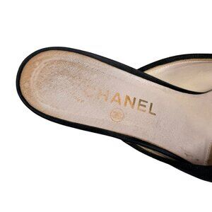The Chanel mules feature a round toe shape and a low kitten heel, making them perfect for any occasion. The black satin upper material is accented with white stripes, a stitched CC logo, and a bow, adding a touch of designer flair. These mules are comfortable and versatile, a must-have addition to any fashion-forward wardrobe.