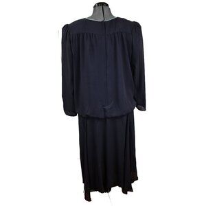 Vintage Chez by Tandy black formal maxi dress. Blouson drop waist style and sheer, chiffon fabric. Fully lined and long sleeves. Features faux diamond rhinestones all along neckline and wrists. V neck and shoulder pads. Invisible back zipper closure.