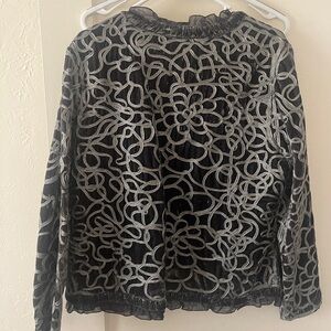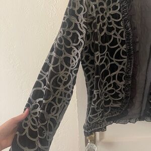Stylish Chico's jacket with a unique pattern. Features charcoal and black tones.