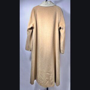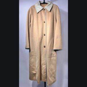 A warm beige woven coat with cream/off white leather collar neck a and front signature turnlock closures in gold metal color along the leather placket with deep side-entry side pockets to eliminate the need for a purse and the long sleeves have leather trimmed cuffs. The turnlocks are functional. This Coat could use some TLC but still amazing and ready to warm up your fall and winter, most of this coats are collectible fashion items.