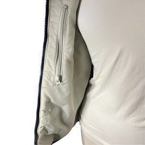 Navy blue and beige vintage ski jacket features a full zip front closure, attached hood with stand collar, 2 outer pockets and one interior. Adjustable wrists and hood pulls.