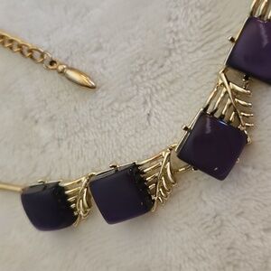 This stunning necklace features a beautiful combination of purple lucite and gold accents, perfect for adding a touch of elegance to any outfit.