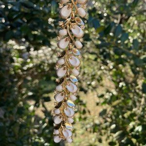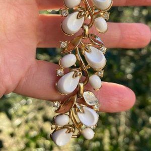 • Beautiful Vintage 1960s Crown TRIFARI Signed Gold Tone Leaf Bracelet with Pretty White Thermoset Leaves and Clear Rhinestones