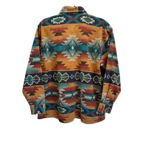 Bring bold Southwestern style into your wardrobe with this vintage Cabela’s flannel shirt. Features an allover Aztec print in rust, teal, mustard, and navy. Collared button-down with long sleeves and button cuffs. Made in USA quality. Perfect for layering as an oversized shirt or shacket.