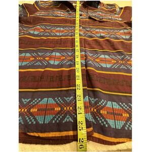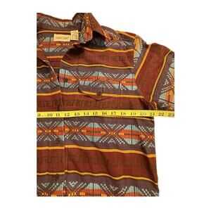 • Features: Thick quality cotton, Aztec stripe pattern (earth brown, teal, rust), button front, chest pocket, collared neckline, button cuffs