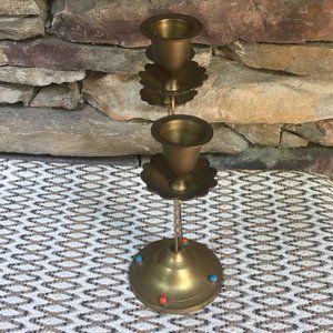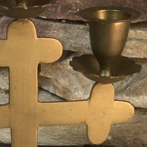 VTG Cabochons Cross Candelabra Boho Brass Religious Candle Holder Christian