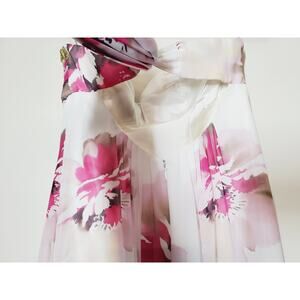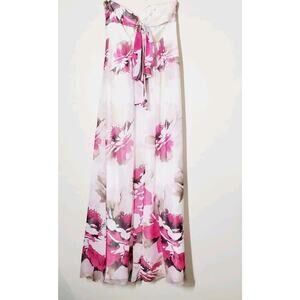 VTG Cache Dress Womens 0 Floral Print Evening Gown Prom Formal Strapless White & Pink 90s Chiffon Flowing Gown Ties in back, Lined, gripping inside chest to help it stay up, Homecoming, event dress