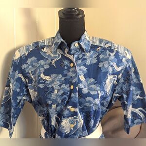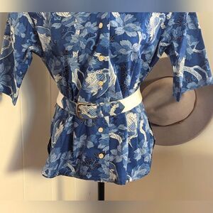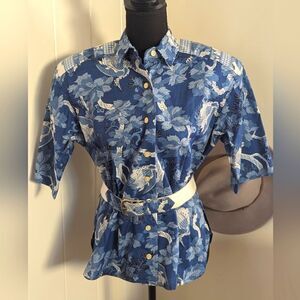 Description: VTG California Design by Dorothy Samuel 6 Retro Animal Print Cranes Patchwork Top, comes with matching belt that can be worn with or without, pointed collar, shoulder pads, one of the belt loops is loose but otherwise she's in great condition