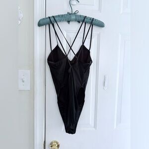 VTG California Dynasty Black Velvet Strappy Bodysuit Size L
