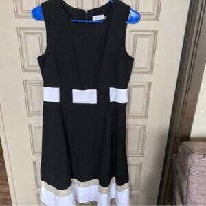 VTG Calvin Klein Dress Blk/Wht/Tan Fit and Flare Sz10 Zip Round Neck Sleeveless