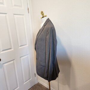 Elevate your wardrobe with this classic Calvin Klein blazer sport coat. Crafted from 100% wool, this gray jacket features a notch lapel style, four-button sleeve button style, and double-vented jacket vent style. The jacket cut is single-breasted and has a two-button front button style.