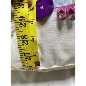 The spring scene features the camper with a blue daisy embellished taffeta body, tie dyed windows and door, a button wheel, and small flower shaped button door knob. There is a field with a variety of quilted flowers, accented with by a bee button, to the left, and a bicycle on the right. There is a charm of a pair of pink flip flops with glittery palm trees on the quilted path to the door. A tie dyed pennant banner runs through the glitter detailed sky with bright flower buttons.
