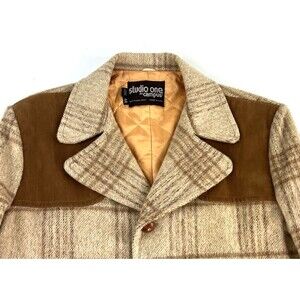VTG Campus Studio One Plaid Flannel Sport Field Jacket Coat Beige Wool 44L Mens