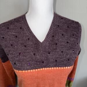 VTG Caribbean Pacific Womans V-neck Sweater Sz S Wool Blend Sequins Autumn Color