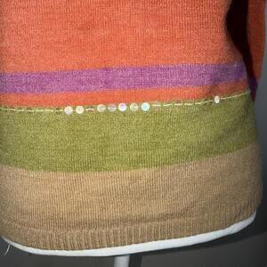 Chic and cozy colorblock sweater in warm autumn tones by Caribbean Pacific. Features a soft acrylic-wool blend knit with decorative sequins accenting the stripe details and subtle textured dot pattern on the upper bodice. V-neckline and long sleeves.