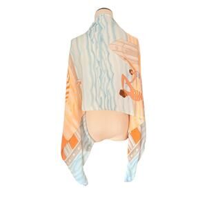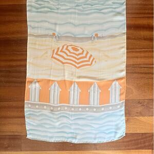 This lightweight scarf features a beach scene with a striped beach umbrella, two women in vintage swimsuits, beach changing cabanas, and couples strolling along the shoreline. Lightweight and multiuse - can be worn as scarf for neck, handbag or hair.