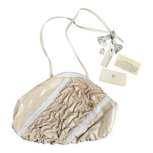 Features: Ivory/cream patent and textured leather, ruched/gathered detailing, gold-tone hardware, shoulder strap