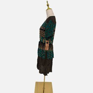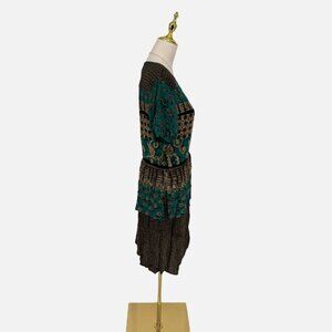 vintage carole little, carole little petite, carole little view point, vintage dress size 10, petite size 10 dress, tie front dress, boho midi dress, panel print dress, short sleeve dress, ethnic print dress, retro 90s dress, casual summer dress, festival boho dress, artsy print dress, womens vintage clothing, bohemian style dress, unique print dress, eclectic style dress, view point dress, boho dress, statement piece clothing, women’s boutique vintage, patchwork style dress, office, workwear, professional