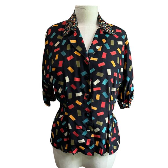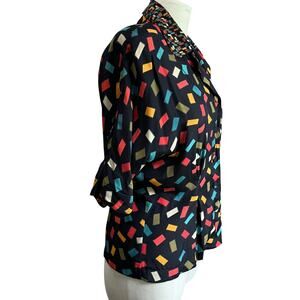 Vintage Carole Little Black Multi colored Confetti Abstract Button Up Blouse Sz 4