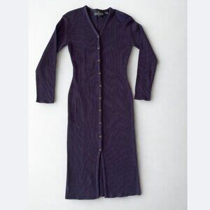 Elevate your wardrobe with this vintage Carole Little sweater dress, crafted for timeless elegance and comfort. The rich plum hue and ribbed wool blend knit create a flattering, figure-enhancing silhouette with stretch to hug curves beautifully. Designed with functional floral-etched buttons down the front, this dress transitions seamlessly from work to evening.
