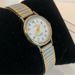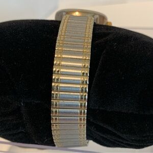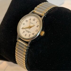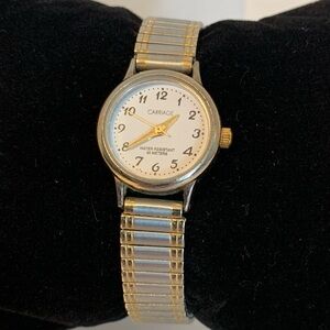 Vintage Carriage by Timex Watch. Women's, Ladies Wrist Watch. Size 6 and Up, Elastic Wrist Band, Stainless Steel Band, 19mm, Gold and Silver Tone, Stretch Band, Water Resistant to 30 Meters, Analog, Quartz, Gold Tone Hands, Round White Dial. Excellent Condition. Vintage. Normal Wear. Tested, Working, Keeps Time. NEW BATTERY!