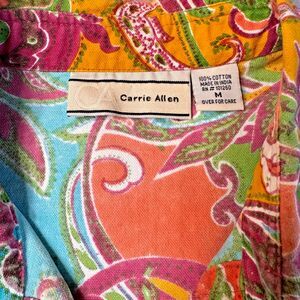 This retro boho canvas jacket features a colorful paisley print in yellow, green, pink, blue, white and orange. Metal buttons provide a front center close, two chest pockets and sleeve cuffs also feature the metal button close. The front of the jacket is embellished with beads and sequins for extra sparkle. Pictures do not do this item justice!