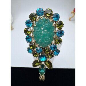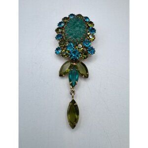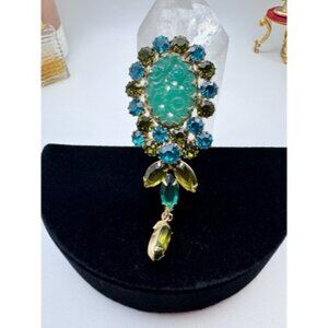 VTG Carved Green Jade Glass Rhinestone Green- Blue Gold Tone Long Dangle Brooch