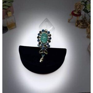 This vintage brooch features a carved green jade glass main stone in an oval shape, accented with green and blue rhinestones. The asymmetrical design is set in yellow gold-plated metal, giving it an elegant and eye-catching look. This dangle brooch has a beauty and elegance theme, making it suitable for any occasion. With its unisex appeal, this Austrian-made piece adds a touch of vintage charm to any outfit.