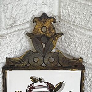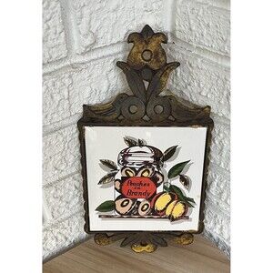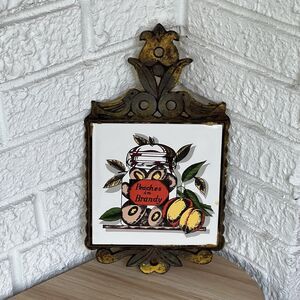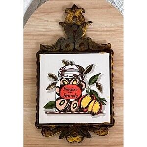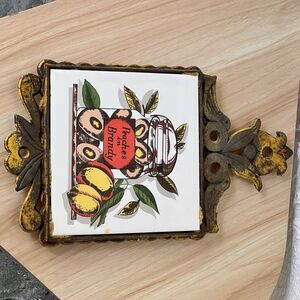 VTG Cast Iron Ceramic Tile Footed Trivet PEACHES in Brandy Rustic MCM Farmhouse