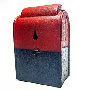 Very well maintained vintage cast iron coin bank celebrating the United Stated Post Office, a red and blue mailbox with functioning hinged drawer.