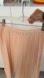 Pale peach blouse with shoulder pads, pullover, button up, stretch waistband and sleeves. Matching pleated sweater skirt, elastic waist. Polyester fabric of top has a sheen. Roomy. Size 12 (but model is a 6). No flaws, mint condition!