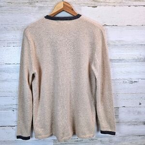• This beige V-neck sweater features a classic button-up front with dark contrasting trim, adding a touch of preppy sophistication to your wardrobe.