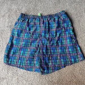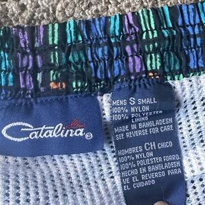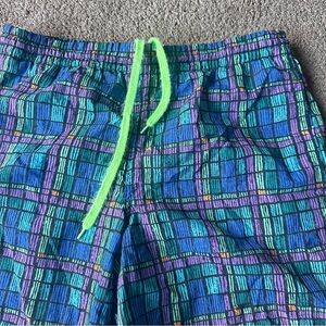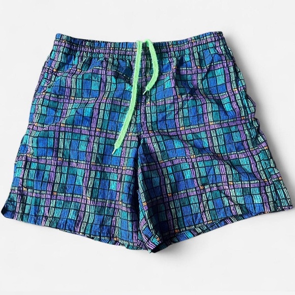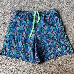 Stylish plaid swim trunks by Catalina. Features a vibrant design. Ideal for beach or pool days.