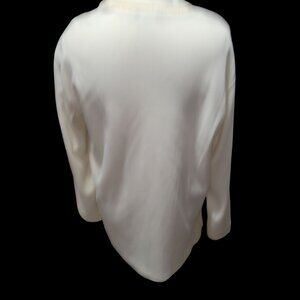 This VTG Cathy Daniels Women's Varsity Boyfriend Cardigan in size M is a soft and elegant sweater with a solid pattern eith gold threaded stripes and tight-knit construction. The gold thread and gold buttons add a touch of sophistication to the ivory and gold color scheme, making it a versatile piece for any season. With a relaxed fit and V-neckline, this cardigan is perfect for a casual yet stylish look, machine washable for easy care and maintenance. Made from a blend of polyester and acrylic, this vintage cardigan from the Dominican Republic is a timeless addition to any woman's wardrobe.
