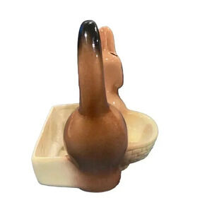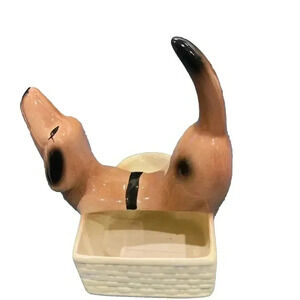 This vintage ceramic dresser caddy features a charming Dachshund design, perfect for any dog lover's collection. Measuring at 7 inches, it is the ideal size for storing small items such as keys or wallets. The caddy is made in the United States and has not been modified, making it a great addition to any vintage collection.