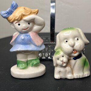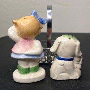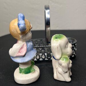 VTG Ceramic Girl & Dog Salt & Pepper Shakers Metal Basket
