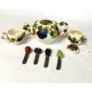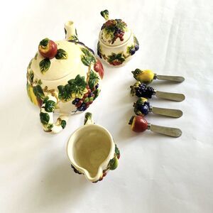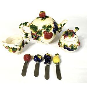 VTG Ceramic Harvest Teapot Set with Sugar Creamer Holder Spreading Knives
