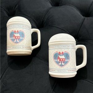 Vintage 80’s or 90’s Ceramic Salt & Pepper Shaker Set. Made in Japan. A fun scene with the words “Welcome Friends” with Hearts, Flowers, polka dots, Geese and barn/cottage house. The cream, bright pink & blue color adds a touch of whimsy to your dining experience. Measurements in photos. Smoke & pet free home. Bundle to save - I have lots of vintage decor & geese items!