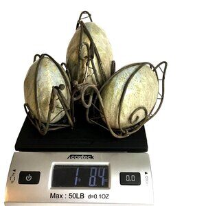 cottagecore decor, fairy garden accessories, ceramic egg set, rustic wire stand decor, handmade style pottery, woodland tabletop accent, shabby chic trinket, spring mantel styling