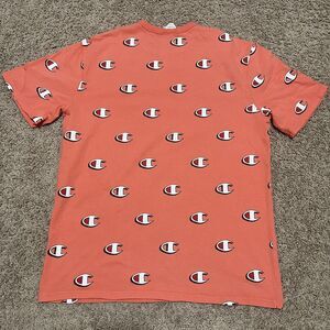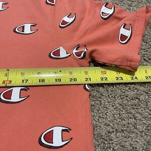 VTG Champion Shirt Mens Large Orange Heritage Scribble AOP Logo Heavy Tee