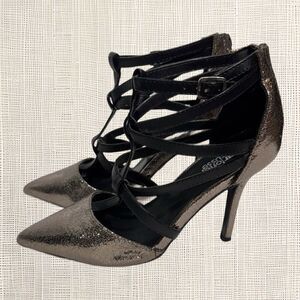 VTG Charlotte Russe Strappy Heels Metallic Gunmetal Pointed Toe Stilettos Size 6