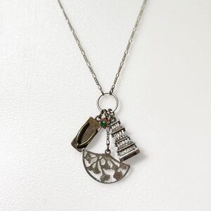 VTG Charm Necklace Asian Theme Mixed Metal Pagoda Geta Sandal Fan Cloisonne Bead