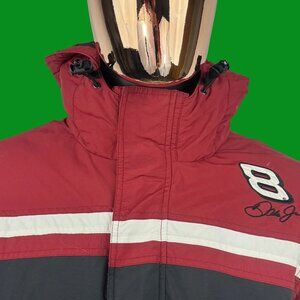 Show your NASCAR pride with this vintage Chase Authentics Dale Earnhardt Jr. #8 Budweiser hooded parka. Designed for both comfort and style, this jacket is perfect for racing fans, collectors, or anyone looking to rock a classic motorsport look.