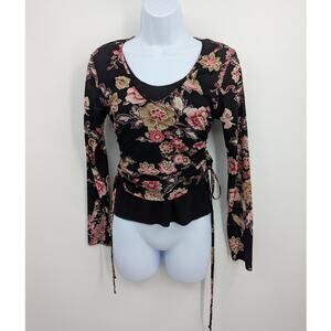 Eyeshadow Floral Ruched Wrap Top M Black Pink Long Sleeve Y2K