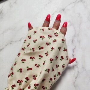 This vintage top is absolutely adorable and features a bolera cropped style, and long sleeves that loop can loop on your finger to stay in place. The novelty cherry print is super cute! Made in Taiwan.