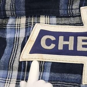VTG Chevrolet Shirt Mens Large Blue Plaid Flannel Embroiderd Patch Racing USA