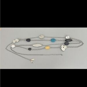This is a vintage Chico's necklace with a 2-strand silver tone chain measuring 39". The necklace features faux stones in black, turquoise, and yellow with mixed shapes. It has a lobster closure and is signed by the brand. This original piece of fashion jewelry is perfect for any occasion.