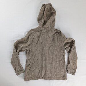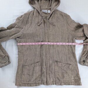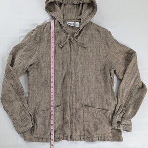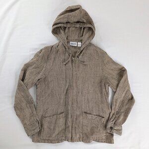 VTG Chico's Brown Linen Zip Up Hooded Mini Checkered Squares Jacket Front Pocket