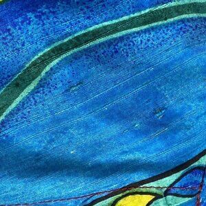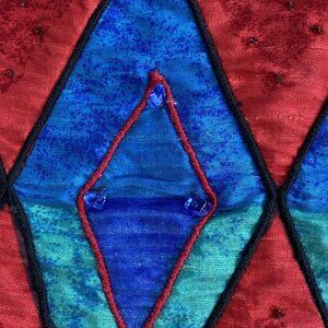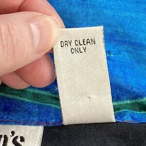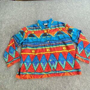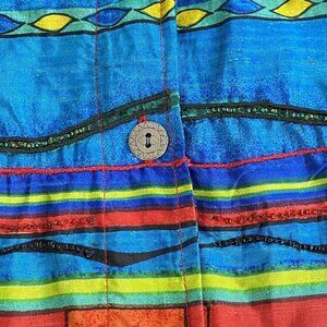 This vintage Chico's jacket is a must-have for any Southwestern themed wardrobe. The jacket features a beautiful geometric pattern, with accents of beads that add a touch of elegance. The jacket is made of silk, making it comfortable to wear and perfect for any occasion. It has long sleeves, a button closure, and is lined with pockets, making it a practical choice too. This jacket is a size L, with a regular fit. It is perfect for anyone who loves the Aztec or 90s style.